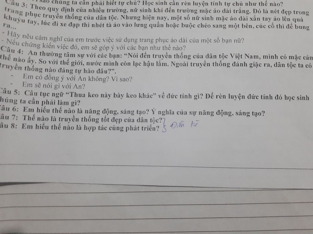 câu 4 an nói vậy là ko đúng vì mỗi dân tộc điều có cách ăn mặc và trang phục khác nhau,